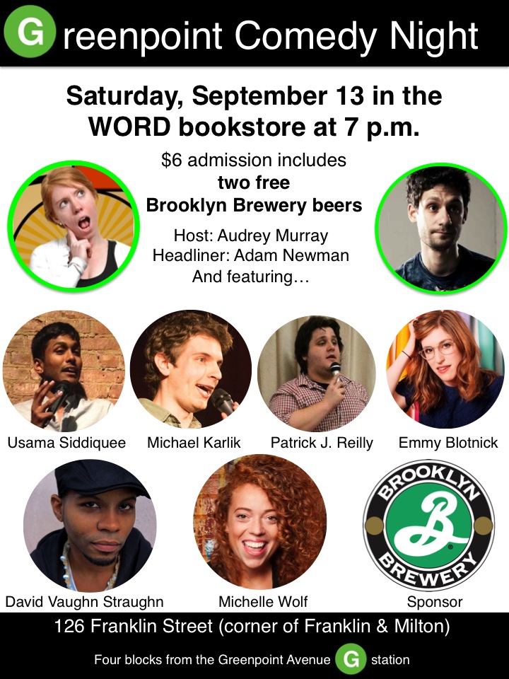 Greenpoint Comedy Night returns to the WORD bookstore! This month’s show features beer from Brooklyn Brewery and headlining comedian Adam Newman (seen on The Late Show with David Letterman). Admission is $6 and includes two beers. Audrey Murray hosts Usama Siddiquee, Michael Karlik, Patrick J. Reilly, Emmy Blotnick, David Vaughn Straughn, and Michelle Wolf on Saturday, September 13 from 7-8:30 p.m. at 126 Franklin Street. Don’t miss it!