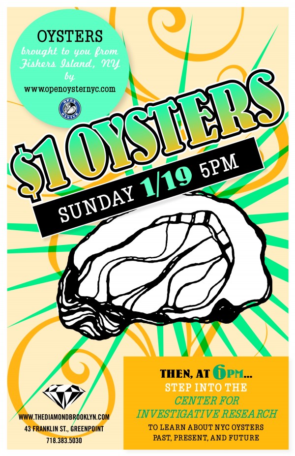 Oyster-Flyer_TabloidIf you are an oyster fanatic, this event on January 19th is most definitely for you!  The Diamond, a very happening bar in Greenpoint, is not only serving up fresh Fischer Island oysters for $1 each starting at 5pm, but they are also featuring a talk about the history of oysters in New York.  Did you know they were extremely plentiful and were equivalent to junk food in the 1800’s?  Learn all about it and so much more!  For more information, click here- http://ht.ly/sD8Un