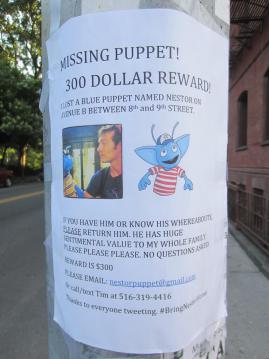 Tim Kubart is the leader of local Brooklyn children’s band, Tim Kubart and The Space Cadets. (The band also happens to be nominated in the Happening List for Best Children’s Performing Artist in Brooklyn! You can vote for them here- http://brooklyn.happeningmag.com/happeninglist/2013/childrens-entertainment/) On August 6th, Tim lost his $1,500 blue puppet, Nestor, who is used in his performances with The Space Cadets. According to an article in The Observer, Nestor was created by Sesame Street muppeteer, Frankie Cordero, and has a huge sentimental value for Tim, and his friends and family. The puppet was last seen in the East Village on Avenue B, somewhere between 8th and 9th Streets. Tim is offering a $300 Reward for anyone who finds his missing partner in crime. If you have seen this puppet, contact Tim! You can follow the puppet’s return home on Twitter with hashtag #bringnestorhome. This sounds like a great premise for a children’s book!!